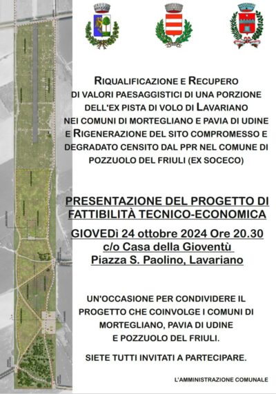 “Riqualificazione e recupero di valori paesaggistici di una porzione della ex pista di volo di Lavariano nei comuni di Mortegliano e Pavia di Udine e rigenerazione del sito compromesso e degradato censito dal PPR nel comune di Pozzuolo del Friuli” Presentazione pubblica del progetto di fattibilità tecnico-economica. VI ASPETTIAMO !
