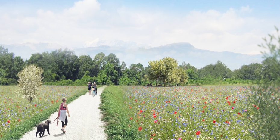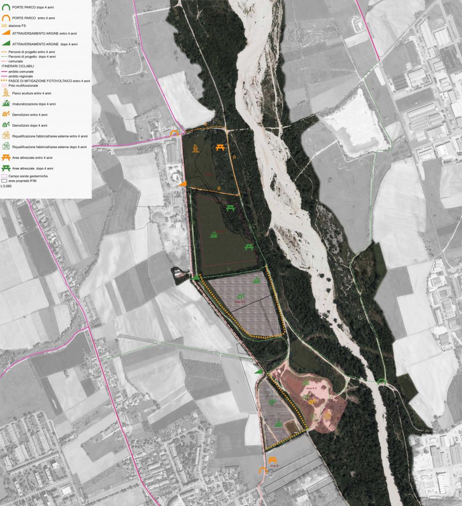 Progetto di riqualificazione di un’area industriale degradata sita all’interno dei confini del Parco del Torre di Udine caratterizzata dalla presenza dell’invaso di una ex cava di inerti (profondo circa 18 m ed ampio circa 8 ha), una discarica chiusa di RSU (della superficie di circa 8 ha), un’area edificata dove si trovano gli impianti di lavorazione degli inerti ormai in disuso. L’intervento prevede la trasformazione dell’intero comprensorio industriale della IFIM s.r.l. di San Gottardo (UD) attraverso la realizzazione di: aree verdi di rinaturalizzazione (prati e boschi di golena), fasce verdi di mitigazione (fasce arbustive), percorsi di progetto, recupero di itinerari ciclabili esistenti, connessioni tra i percorsi, le porte del Parco (gli accessi dall’esterno verso l’interno), le aree attrezzate e di sosta, il polo multifunzionale (sistema del costruito ed estetica industriale), gli impianti di produzione di energia rinnovabile (impianto a geoscambio all’interno del corpo dell’ex cava di inerti ed un campo fotovoltaico sulla baulatura della discarica di RSU).