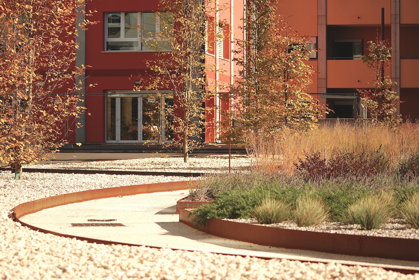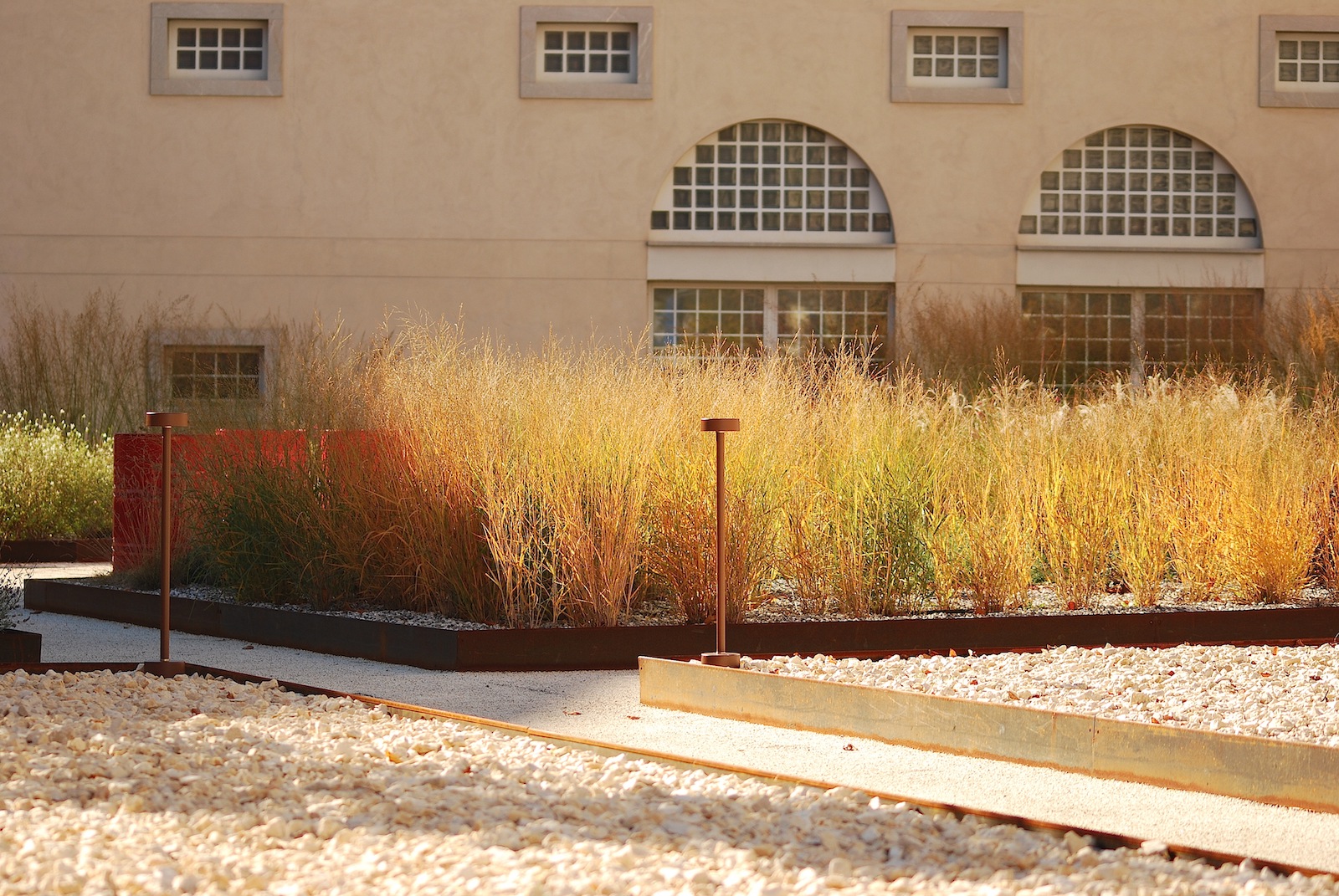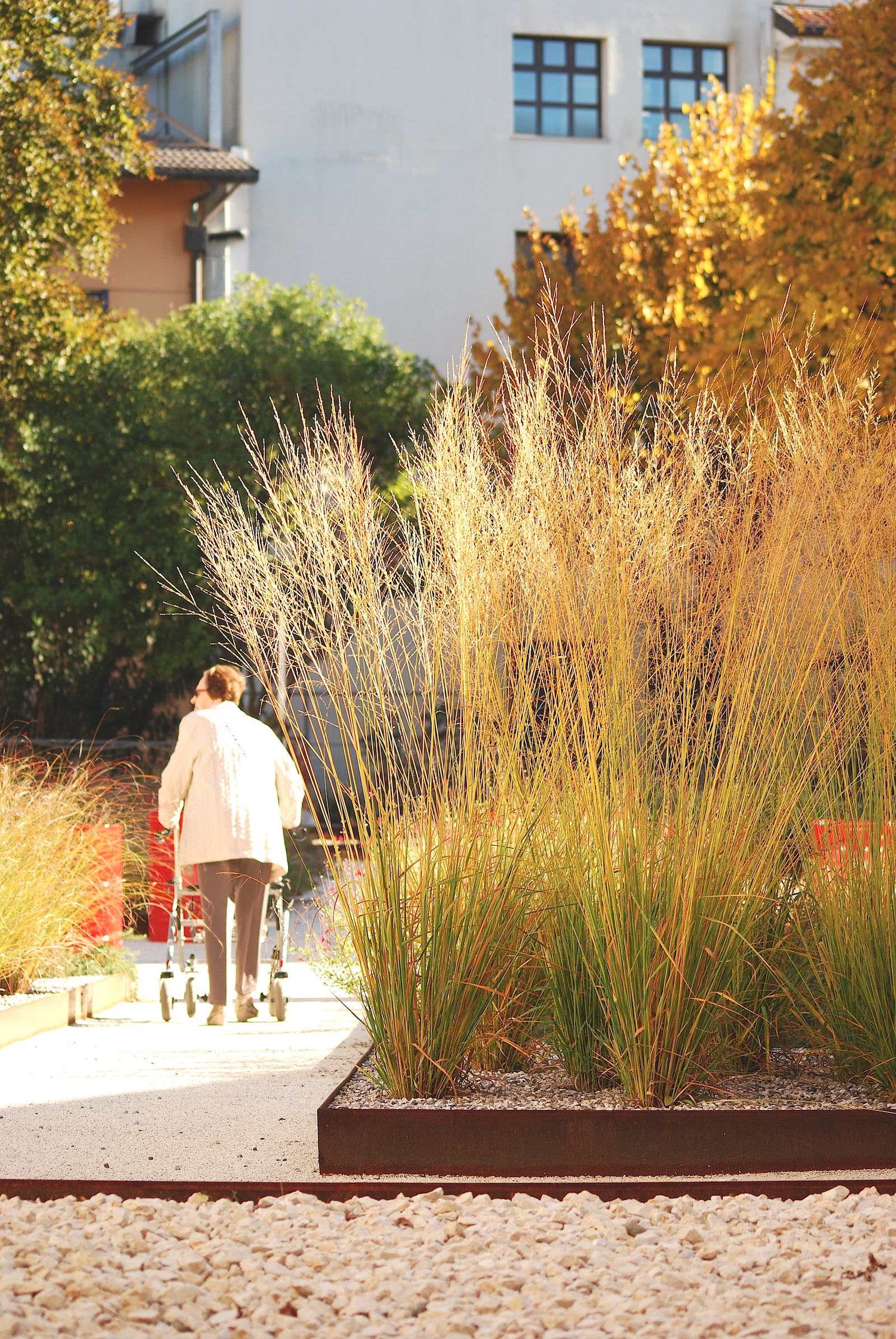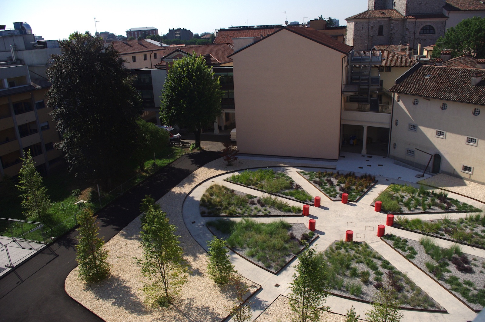 Il giardino terapeutico per la casa di cura “La Quiete” di Udine si trova a pochi passi dal centro cittadino. Organizzato in due zone distinte, un piccolo bosco di faggi ed un parterre elissoidale di graminacee ornamentali e arbusti aromatici dedicato alla cura della sindrome di Alzheimer, ospita un brano di natura all’interno del costruito con oneri manutentivi molto contenuti. L’utilizzo di fasce di acciao corten per disegnare le aree, ghiaia stabilizzata di colore chiaro e cemento bianco per definire i percorsi, fanno da base uniforme al cromatismo dato dalle scelte vegetali.