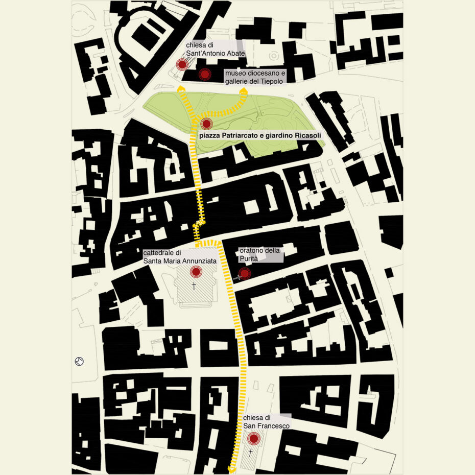 Il progetto prevede una parziale pedonalizzazione di P.zza Patriarcato, con rialzamento del sedime stradale alla quota degli attuali marciapiedi, al fine di realizzare un collegamento protetto tra l’area del Duomo e il museo Arcivescovile (Corridoio del Tiepolo) e ricucire l’ambito della piazza con quello del giardino Ricasoli, attualmente percepiti come distinti, ma afferenti alla medesima area tutelata da vincolo monumentale.