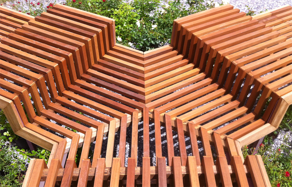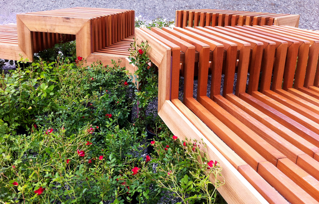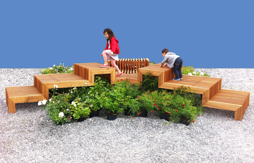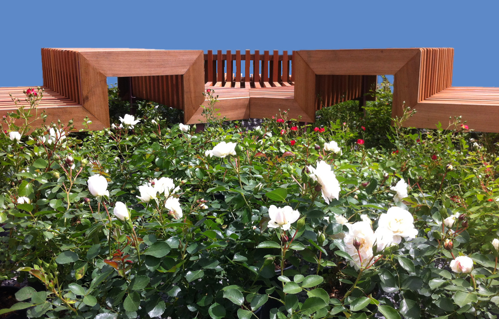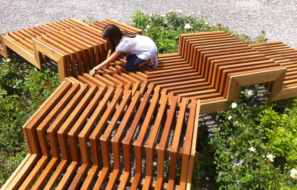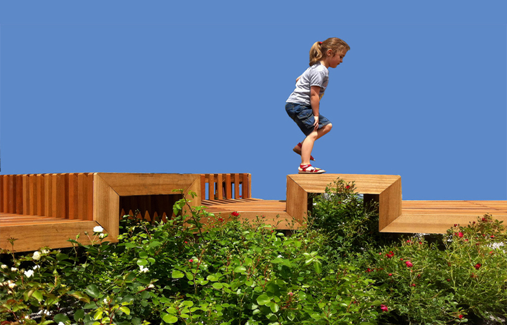 “Siamo sulle spine” è un’installazione presentata per “Avventure creative” nell’ambito del Festival del Verde e del Paesaggio tenutosi a Roma nel 2013. Si compone di tre componenti lignei, la cui forma è originata dal contrasto tra gli assi simmetrici con il perimetro dell’area di 16 mq. I volumi costituiti da listelli di legno da 60 cm, che permettono il passaggio della luce, sospesi su un tappeto di rose tappezzanti. I componenti si ordinano reciprocamente in un assetto radiale, convergendo al centro dello spazio, dove è così creata una superficie condivisa, elemento di unione dei tre. Questa organizzazione permette agli elementi e a coloro che ne usufruiscono un dialogo reciproco, plurale, ma anche un loro utilizzo individuale. Il legno è stato scelto nell’essenza tropicale conosciuta come Okan, derivante dal Cylicodiscus gabunensis, legno dal colore marrone rossiccio con spiccate caratteristiche di resistenza agli agenti atmosferici. La selva di spine è invece costituita dalle rose che raggiungano uno sviluppo massimo in altezza di 70 centimetri, rifiorenti, la cui potatura annuale è leggera.