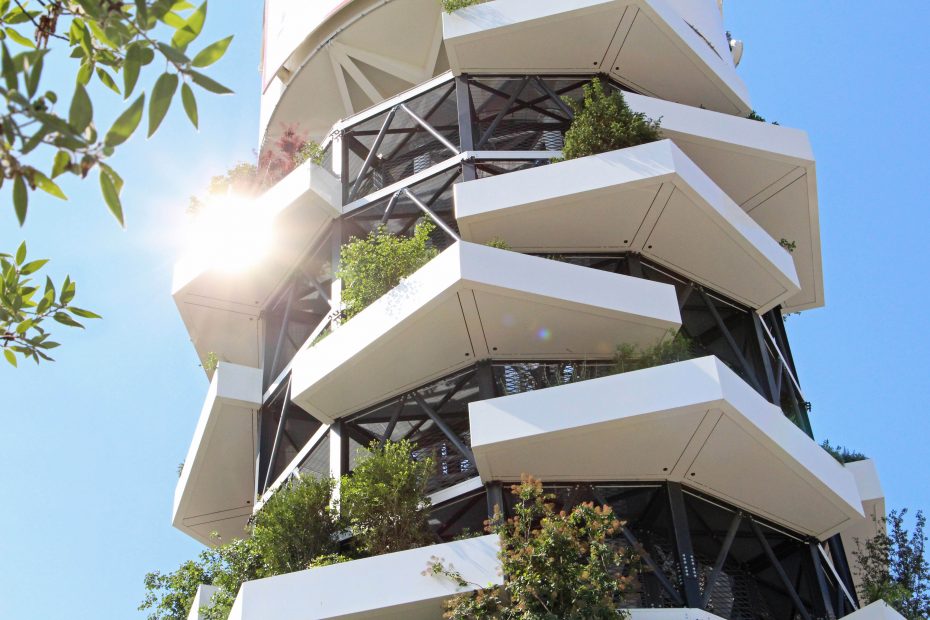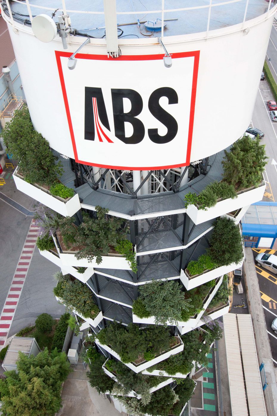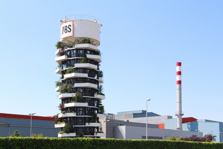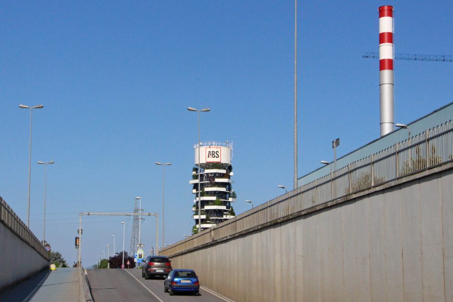 La “Torre ABS” è un progetto per la riqualificazione architettonica della torre piezometrica situata entro il comprensorio delle “Acciaierie Bertoli Safau S.p.a.” e si ispira ai principi fondanti dello Studio Archimeccanica. Essa, infatti, esplicita una sintesi formale tra architettura e natura, con l’obiettivo di raggiungere un equilibrio dinamico tra geometria e meccanica.  Alta 36 metri e con un diametro di 10 metri è composta da una struttura modulare in acciaio. Ogni modulo è dotato di una vasca aggettante a verde pensile. La combinazione di questi, caratterizzata da traslazioni  e rotazioni, determina il volume architettonico. La componente vegetale è costituita da piante caratterizzate da un elevata rusticità, crescita compatta,moderate esigenze idriche, molte sempre verdi,  specie eminentemente ornamentali, ma anche specie che ritroviamo abitualmente nelle nostre campagne in grado perciò di attirare piccola fauna locale (insetti\fiori, bacche\uccelli). “Torre Abs”, pur mantenendo la funzione originale, assume un  nuovo valore simbolico come segno sul territorio (landmark) e come servizio all’ecosistema (assorbimento 1 tonn\anno CO2).